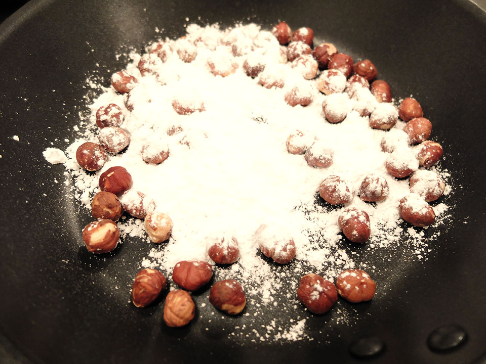 C’est extrêmement facile (bien plus que de faire un caramel). C’est une méthode que j’ai vue chez Christophe Michalak. Mettre les noisettes et le sucre glace dans une poêle anti-adhésive. Faire chauffer, et attendre que le sucre fonde, enrobe les noisettes, et brunisse un peu. C’est rapide, vous verrez ! Sortir du feu avant la surchauffe et laisser refroidir. Puis, mixer grossièrement (il faut garder des morceaux !).