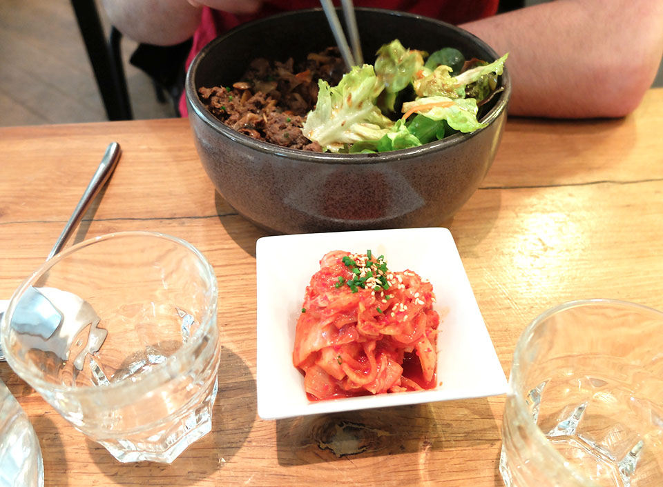 Il s’agit du Bulgogi Dopbap, du bœuf mariné dans une sauce indescriptible qui lui donnait un goût extraordinaire, puis sauté, pour un résultat plein de saveurs, tendre comme pas possible. Servi avec du riz, des petits légumes, le bol entier est difficile à finir tellement il est copieux.